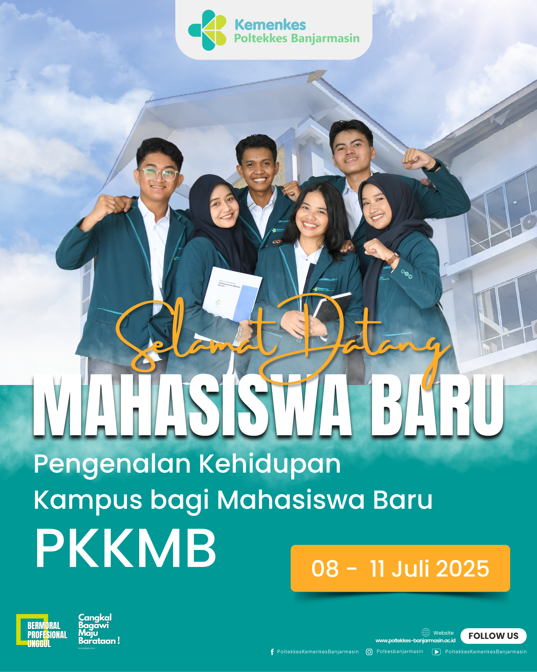 Dalam rangka menyambut mahasiswa baru dan memperkenalkan kehidupan kampus secara menyeluruh, Poltekkes Kemenkes Banjarmasin akan melaksanakan kegiatan Pengenalan Kehidupan Kampus bagi Mahasiswa Baru (PKKMB) sebagai bagian dari proses awal pendidikan di lingkungan kampus.