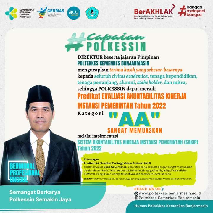 Direktur beserta jajaran Pimpinan Poltekkes Kemenkes Banjarmasin mengucapkan terimakasih yang sebesar-besarnya kepada seluruh civitas academica, tenaga kependidikan, tenaga penunjang, alumni, stake holder dan mitra sehingga Poltekkes Kemenkes Banjarmasin dapat meraih Predikat ‘AA’ melalui Implementasi SAKIP tahun 2022.