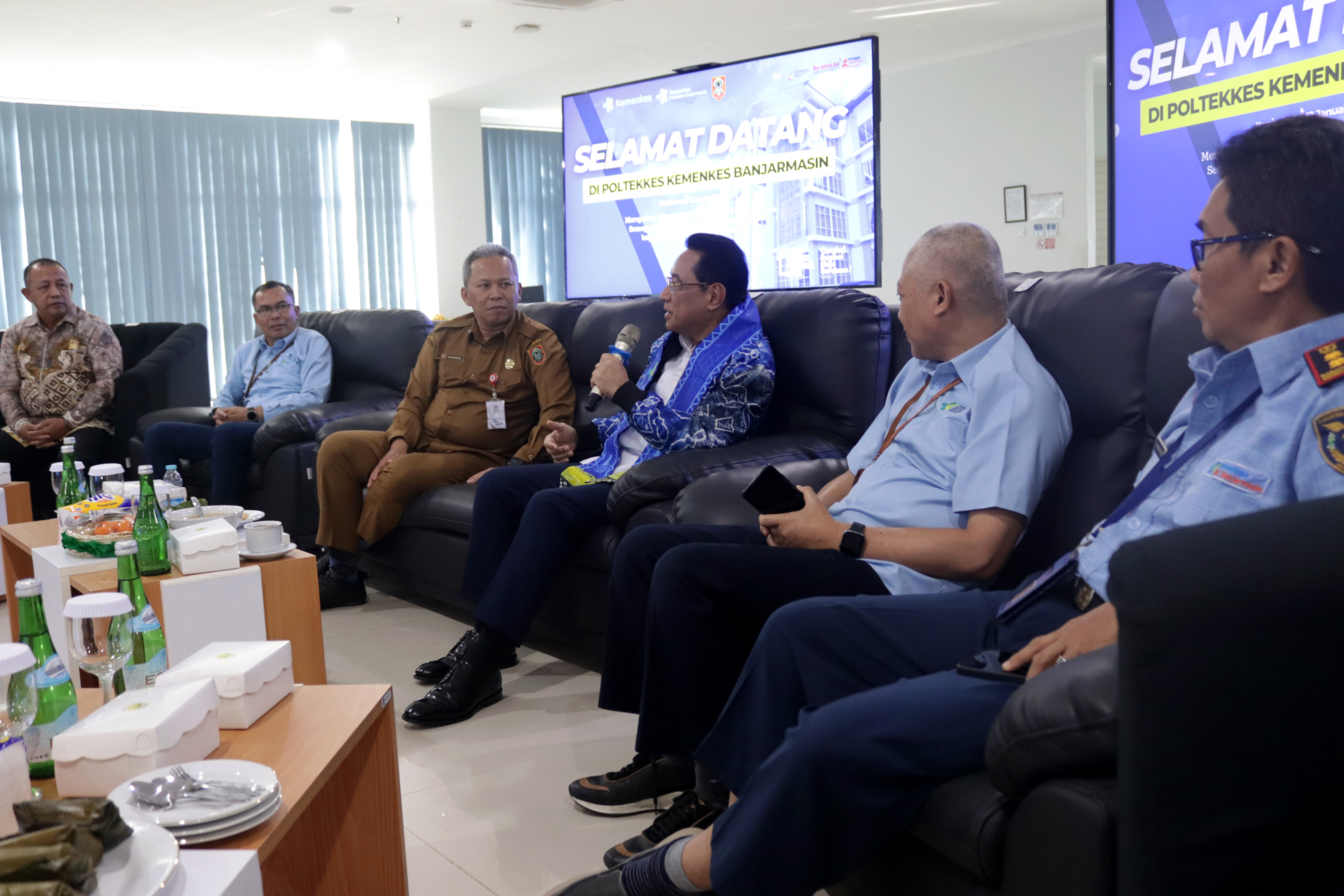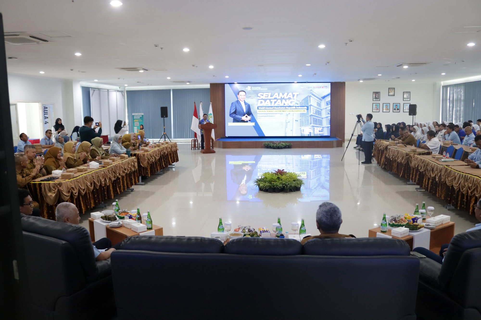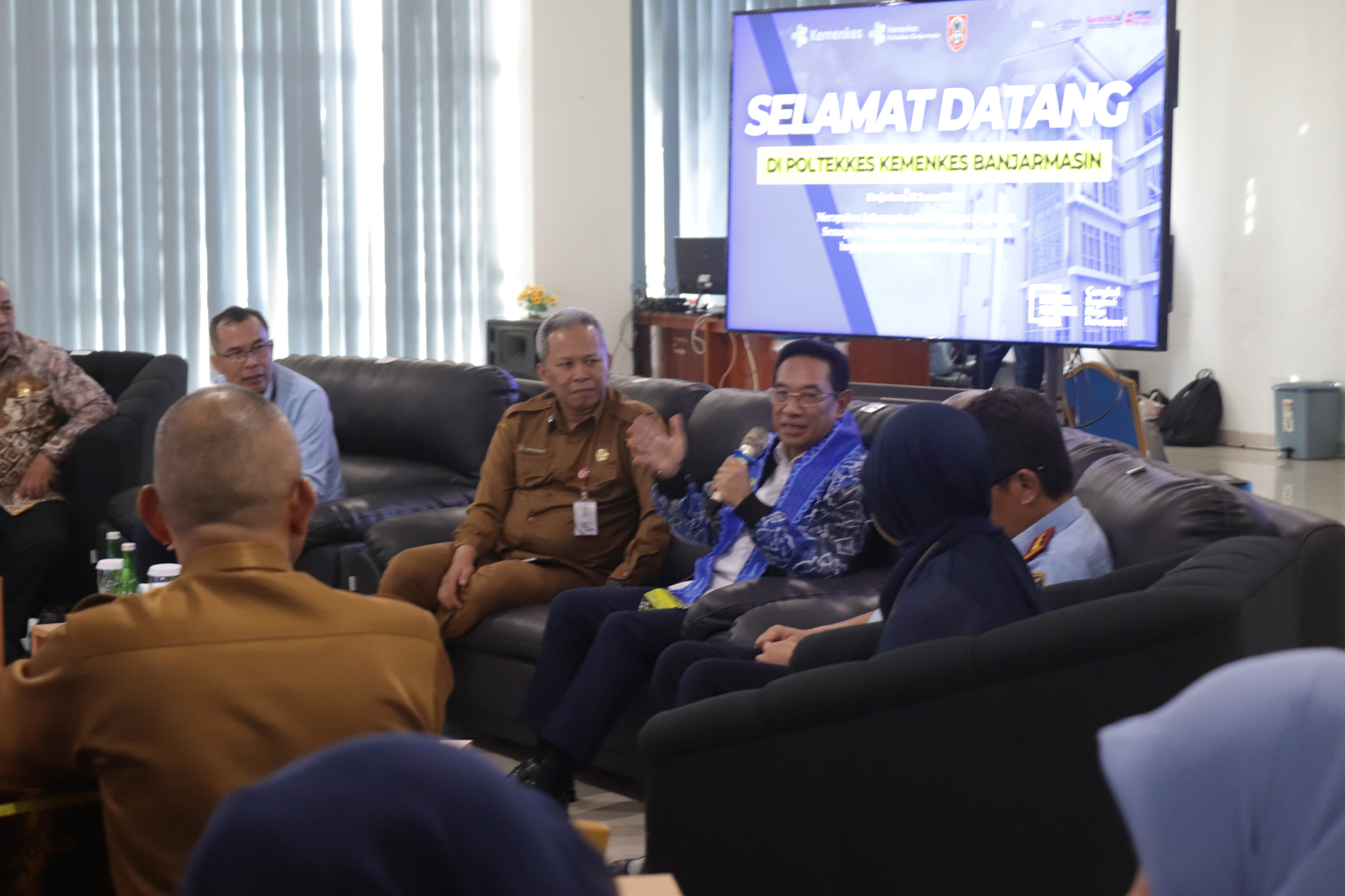 Kegiatan diawali dengan sambutan Plt. Direktur Poltekkes Kemenkes Banjarmasin yang menyampaikan gambaran peran dan komitmen institusi dalam mendukung pembangunan kesehatan nasional. Acara kemudian dilanjutkan dengan arahan Wakil Menteri Kesehatan serta sesi tanya jawab bersama mahasiswa dan perwakilan instansi terkait. Seluruh rangkaian kegiatan berlangsung dalam suasana santai, dialogis, dan penuh kekeluargaan.