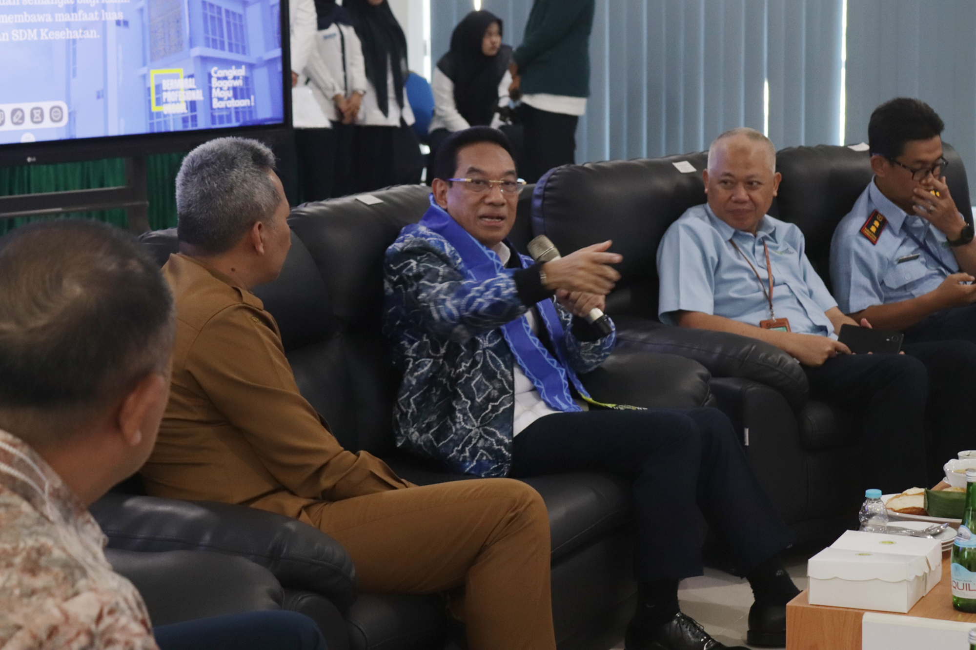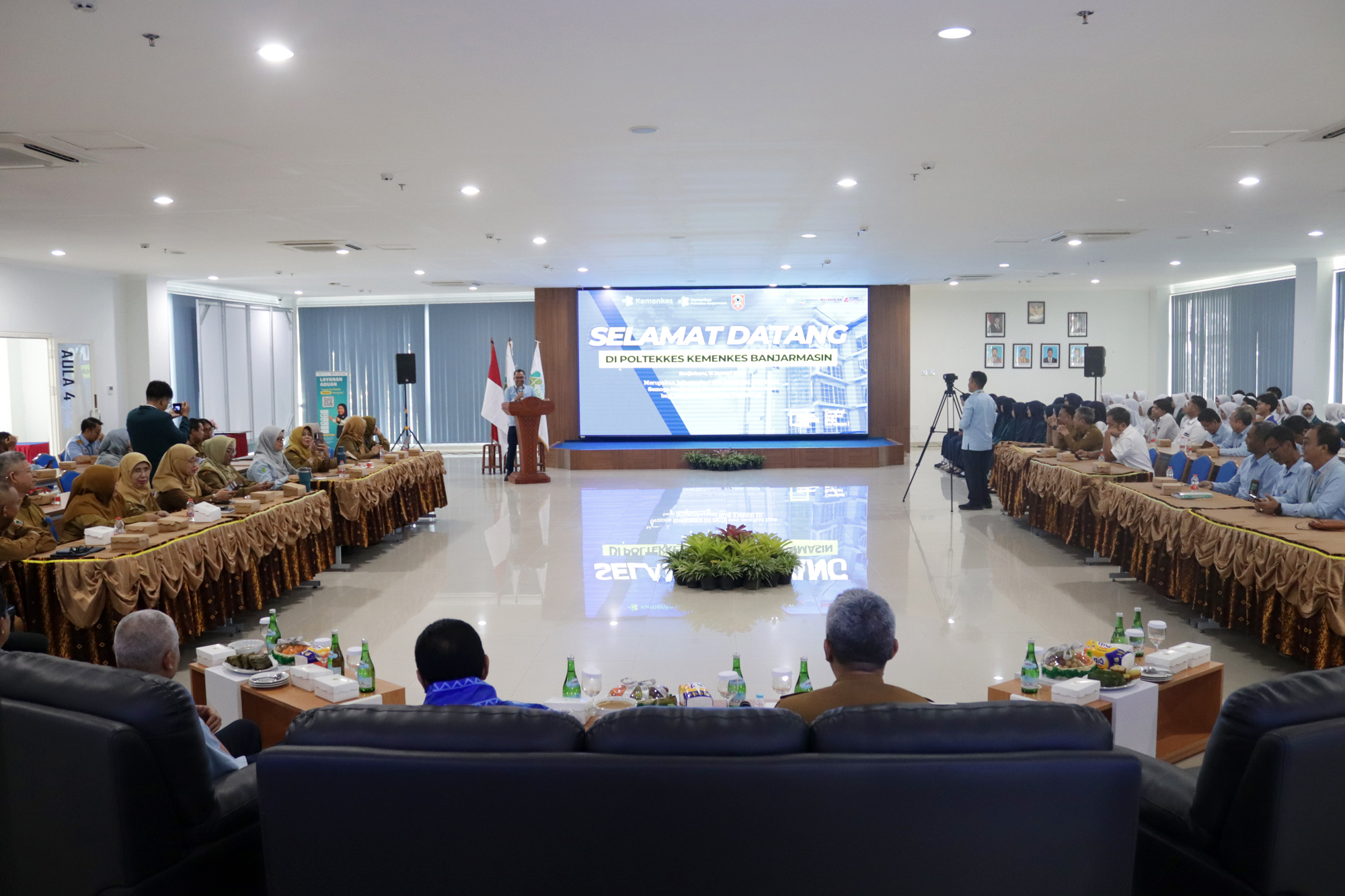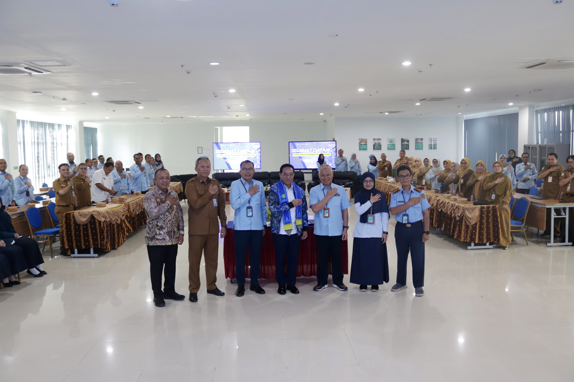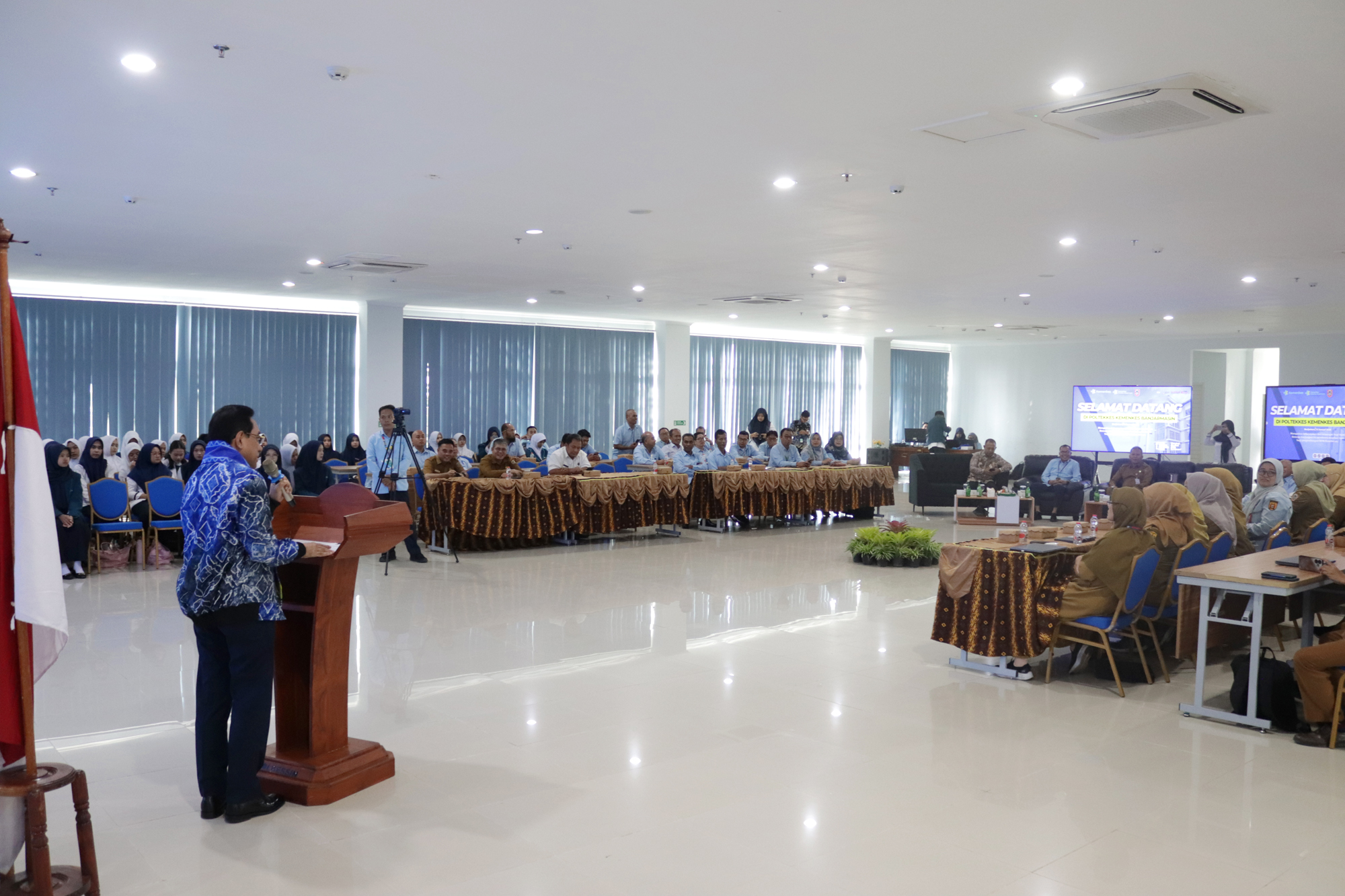 Kegiatan diawali dengan sambutan Plt. Direktur Poltekkes Kemenkes Banjarmasin yang menyampaikan gambaran peran dan komitmen institusi dalam mendukung pembangunan kesehatan nasional. Acara kemudian dilanjutkan dengan arahan Wakil Menteri Kesehatan serta sesi tanya jawab bersama mahasiswa dan perwakilan instansi terkait. Seluruh rangkaian kegiatan berlangsung dalam suasana santai, dialogis, dan penuh kekeluargaan.