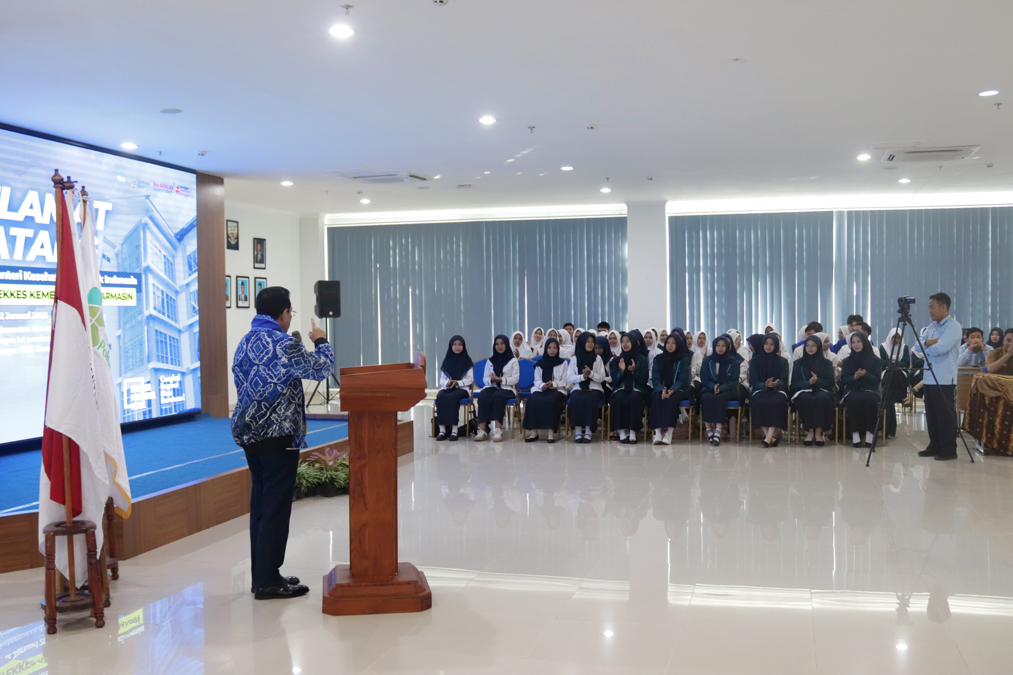 Kedatangan Wakil Menteri Kesehatan disambut langsung oleh Plt. Direktur Poltekkes Kemenkes Banjarmasin, Dr. Junaidi, SKM., MS, bersama dosen dan mahasiswa. Turut hadir Kepala Dinas Kesehatan Provinsi Kalimantan Selatan dr. Diauddin, M.Kes, Kepala BBLKM Banjarbaru Budi Santoso, S.KM., MPH, Plt. BKK Kelas I Banjarmasin M. Rasyid Ridha, SKM., MKL, Kepala LAPFK Banjarbaru Yuni Irmawati, SKM., MA, Anggota DPRD Provinsi Kalimantan Selatan Nur Fajri SE serta unsur pimpinan Poltekkes Kemenkes Banjarmasin yang meliputi para Wakil Direktur, Kepala Subbagian, dan Kepala Pusat.