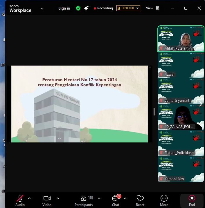 Kegiatan dibuka secara resmi oleh Direktur Poltekkes Kemenkes Banjarmasin, Dr. H. Parellangi, S.Kep., Ners., M.Kep., M.H. Dalam sambutannya, beliau menyampaikan harapan agar webinar ini dapat menjadi langkah konkret dalam memperkuat komitmen seluruh elemen organisasi dalam membangun budaya kerja yang bersih, transparan, dan berintegritas. “Melalui webinar ini, kita semua dapat memahami pentingnya integritas dan transparansi dalam tata kelola organisasi serta bagaimana mengelola konflik kepentingan dengan baik. Dengan demikian, kita dapat semakin siap dalam mewujudkan Poltekkes Kemenkes Banjarmasin sebagai wilayah yang bebas dari korupsi,” ujar beliau.
